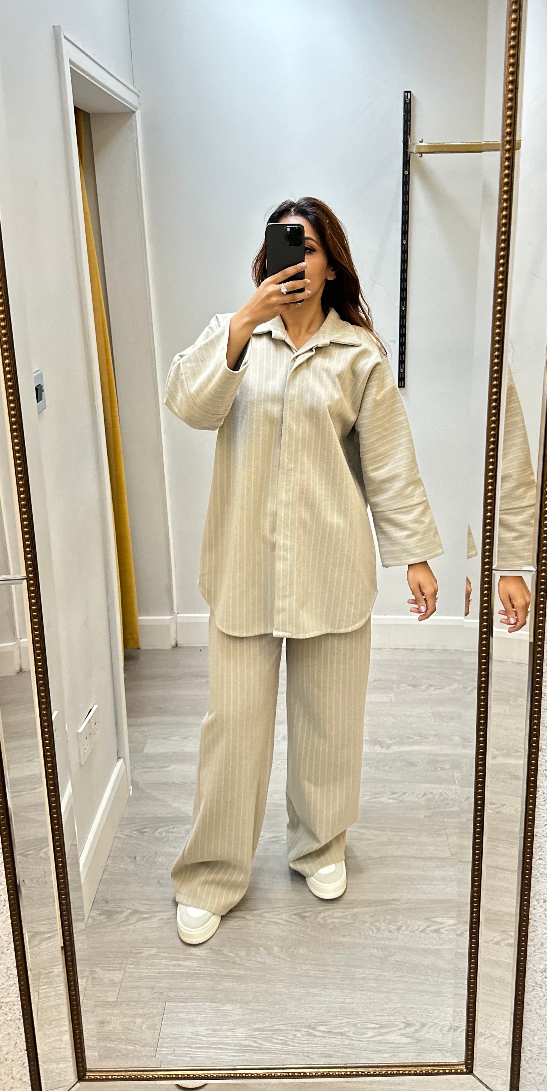 This Pinstripe Coord is made from a warm winter fabric and features a timeless pinstripe design. With buttons down the front, this versatile piece can be worn as a shirt, making it a practical addition to any wardrobe. Stay cozy and stylish with this must-have winter essential.