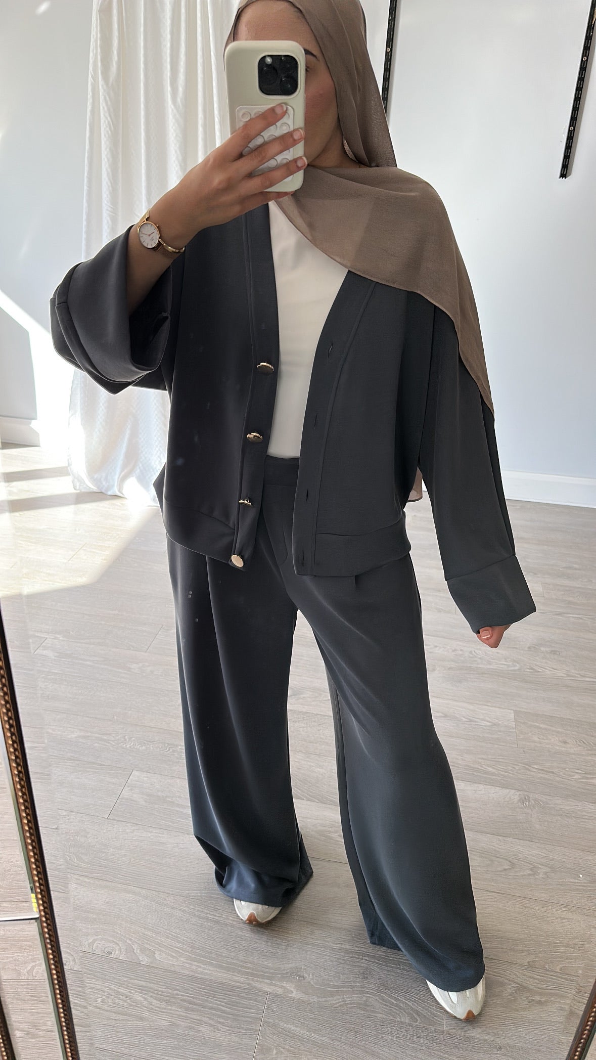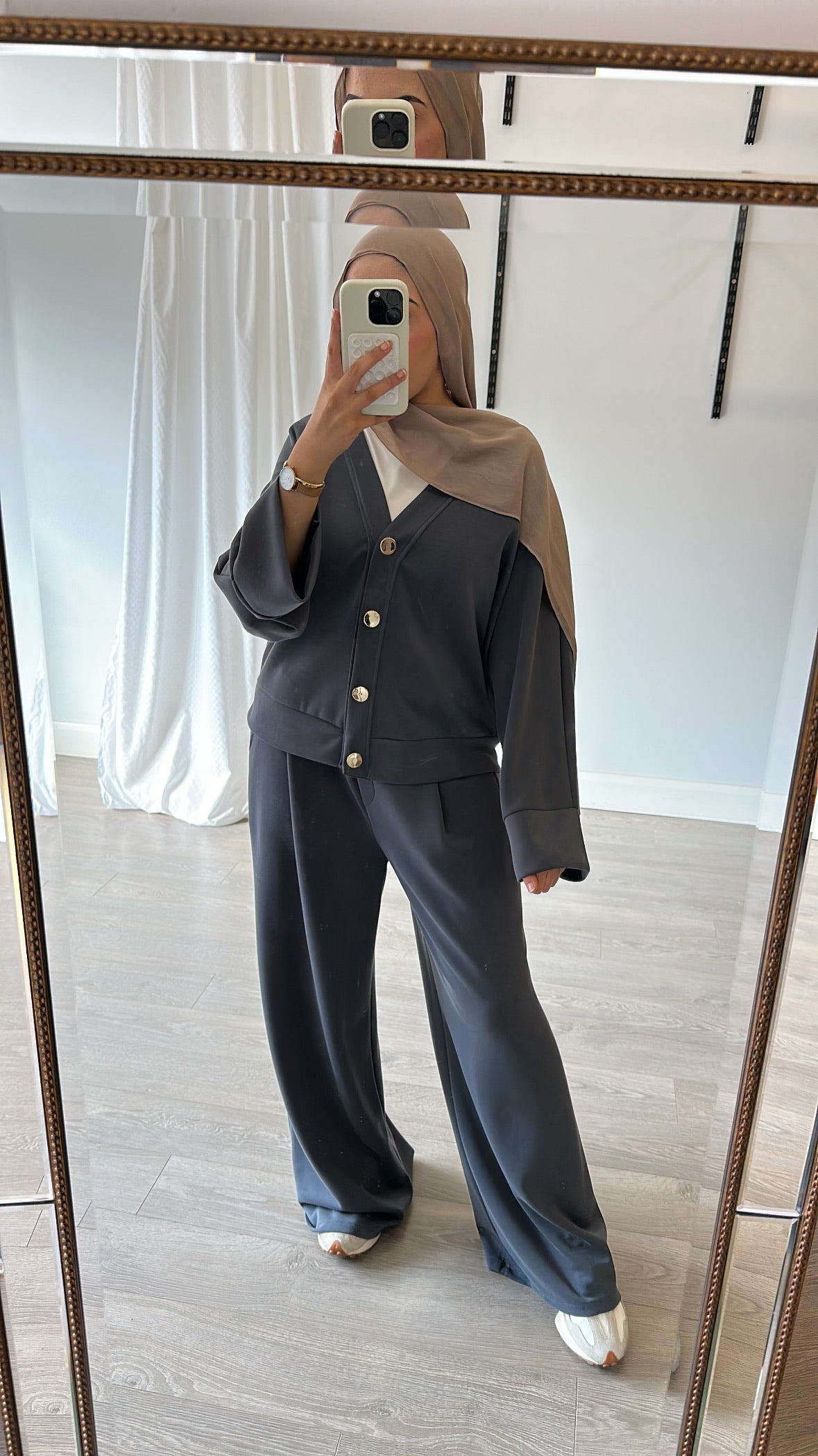 Upgrade your style game with our Taylor Coord. Made with luxurious, buttery soft winter fabric and featuring gold button details, this versatile cardigan set can be worn all year round. The trouser includes pockets and button details, while the top can be worn open or closed, tucked in or out, and as separates. A must-have for any fashion expert.