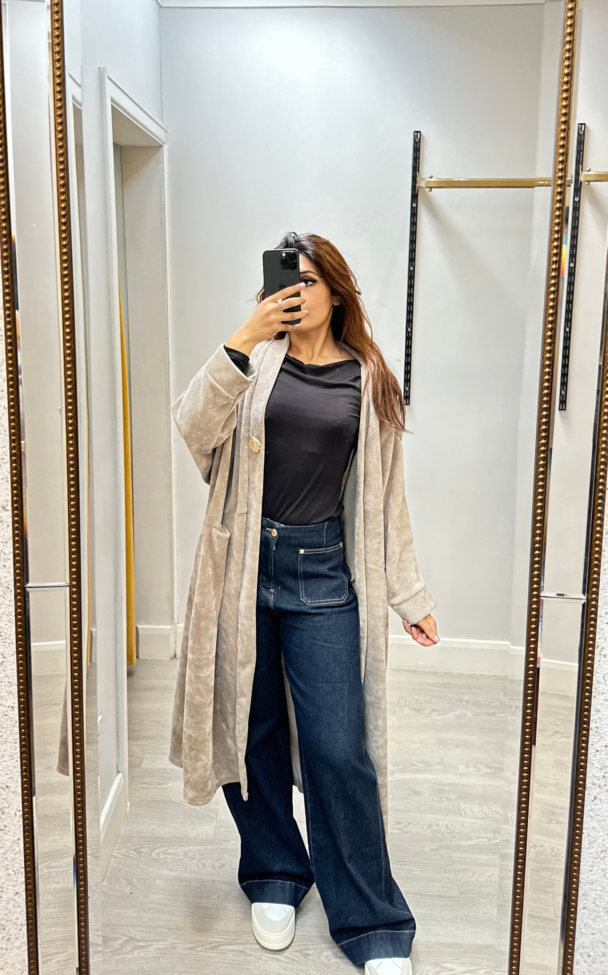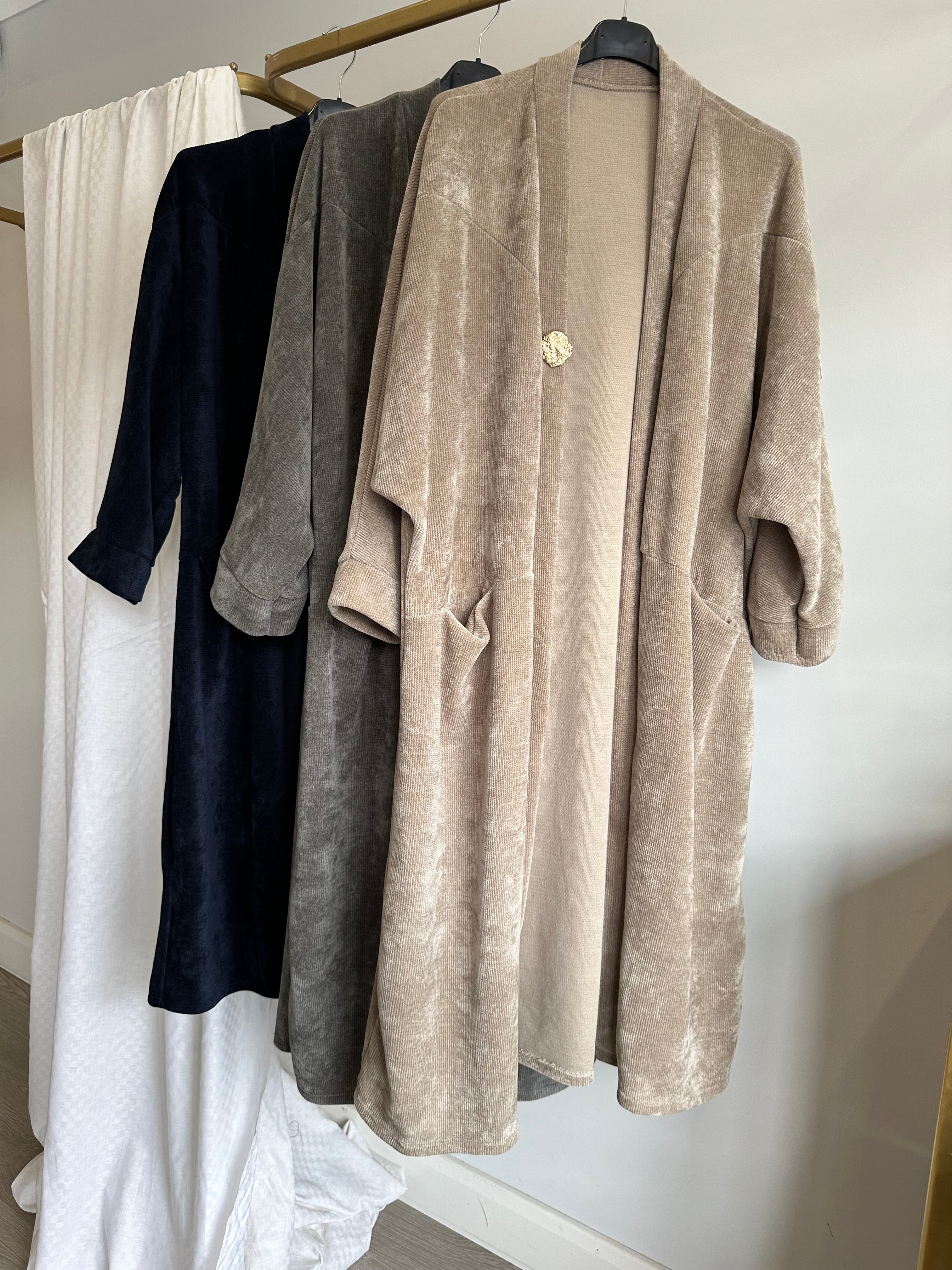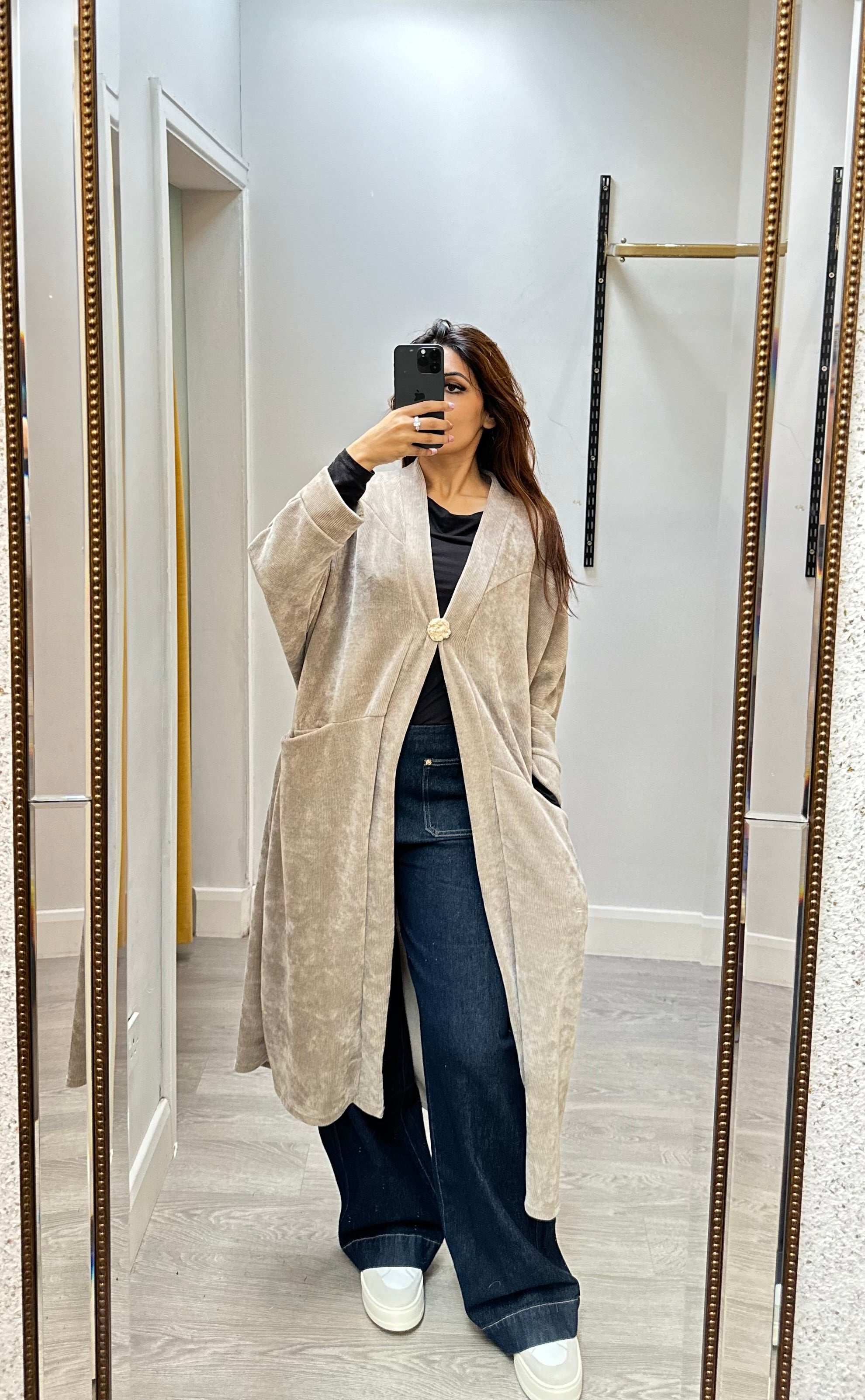 Made with a warm velvety feel crushed fabric, this cardigan is both effortless and comfortable. The elegant brooch adds a touch of sophistication, whilst holding the cardigan together if you prefer.